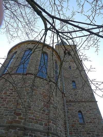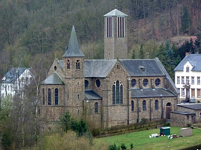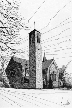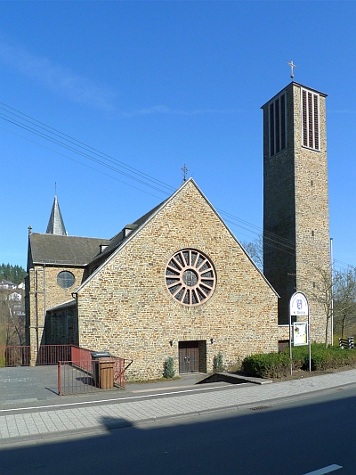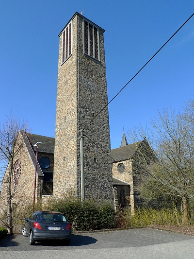 1906-07 von Carl Rüdell und Richard Odenthal, Köln erbaut. Basilika aus Bruchstein mit Querhaus. [2]