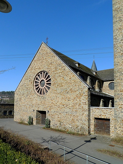 Neuspätromanische Bruchsteinbasilika, 1906/07; Gesamtanlage mit Pfarrhaus (Kölner Straße 69). [1]