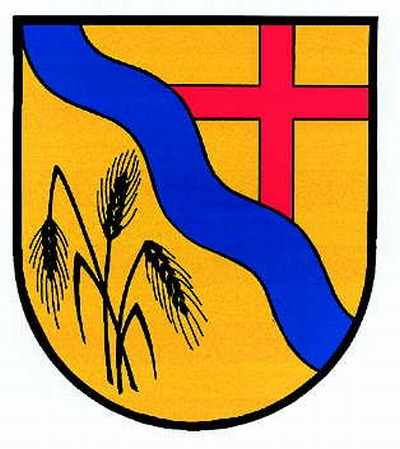 In Gold, durch einen schrägrechten blauen Wellenbalken geteilt, vorn drei schwarze Getreidehalme, hinten ein rotes durchgehendes Kreuz.