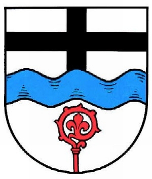 In silbernem Schild ein blauer Wellenbalken, oben ein schwarzes Balkenkreuz, unten ein aufsteigender roter Krummstab.
