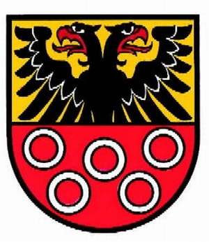 Im geteilten Schild oben in Gold ein wachsender, doppelköpfiger, rot bewehrter, schwarzer Adler, unten in rot 5 (2:1:2) silberne Ringe.