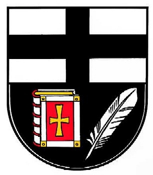 Von Silber über Schwarz geteilt, oben ein schwarzes Balkenkreuz, unten rechts ein silbern gefaßtes, rotes Buch mit goldenem Kreuz, links eine weiße Feder.