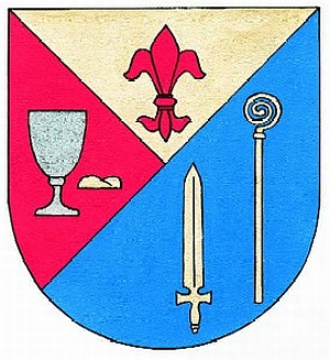 Schild halbrechts und schräglinks geteilt, oben in Gold eine rote Lilie, vorne in Rot ein silberner Kelch, daneben links ein goldener Wecken, hinten in Blau ein aufgerichtetes goldenes Schwert, links daneben ein stehender goldener Bischofsstab.