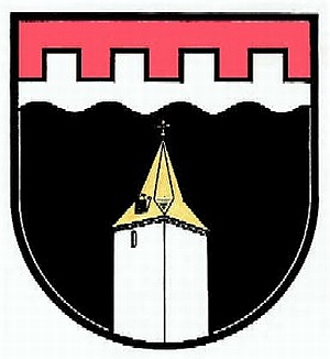 Unter einem durch Zinnenschnitt von Rot und Silber geteilten Wellenschildhaupt in Schwarz wachsend ein silberner Kirchturm mit goldenem Dach.