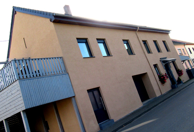 Verputzter Schieferbruchsteinbau unter schiefereingedecktem Satteldach. Schlicht ausgebildetes, 1880 datiertes Quereinhaus aus dreiachsigem Wohnteil und Ökonomie mit Stallteil. An den Giebelseiten Anbauten mit Pultdächern, wobei der Schuppen am Wohnteil von Stützen getragen wird; hier der Kellerabgang und der Backofen.