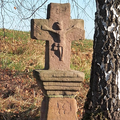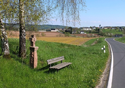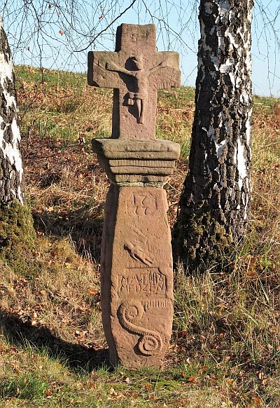 Westlich des Orts steht ein durch seine Schwellung gedrungen wirkender Schaft des Wegekreuzes aus rotem Sandstein von 1777. Unter der Datierung trägt er die plumpen Reliefs eines länglichen Gegenstands, eines liegenden Mannes, die Inschrift MATHIS MEDZEN und eine kräftige Doppelspirale. Die Seiten zieren stilisierte, von Quasten herabhängende Blüten. Eine mächtige Platte trägt das Abschlusskreuz mit Korpus. Das liegende Männlein und der Gegenstand darüber können als Hinweis auf ein Sühnekreuz aufgefasst werden. [1]
