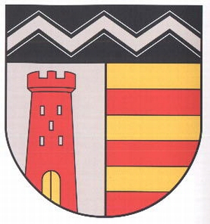 Unter schwarzem Schildhaupt mit Sparrenbalken in Silber, gespalten, vorn in Silber ein wachsender roter Burgturm mit goldenem Tor, hinten fünffach von Gold und Rot geteilt.