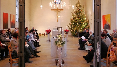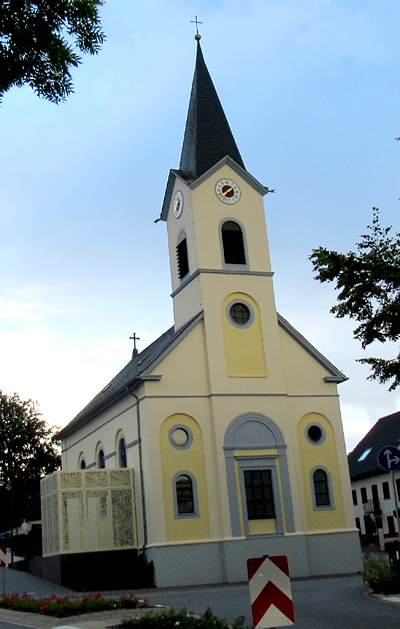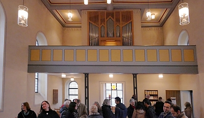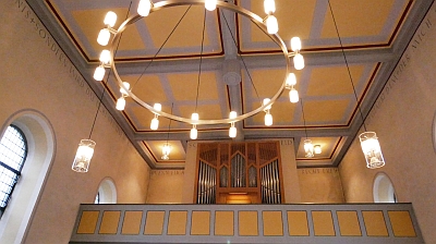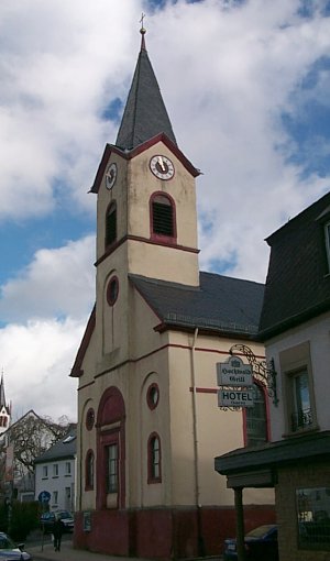 Kleiner klassizistischer Saal mit einbezogenem Westturm, bezeichnet 1853. Ältestes Stahlgeläut Deutschlands. [2]