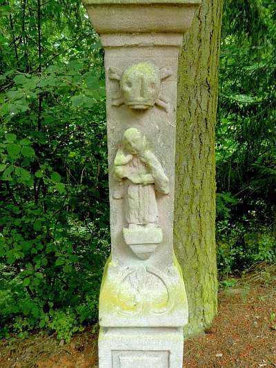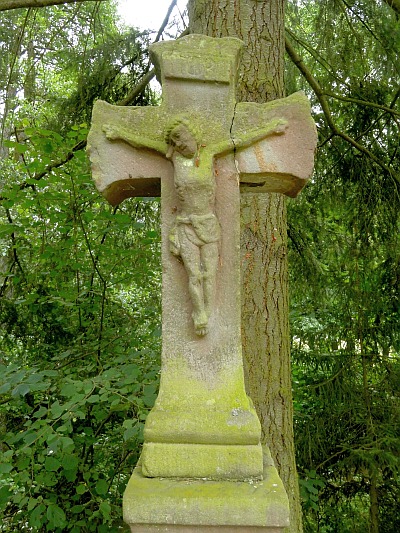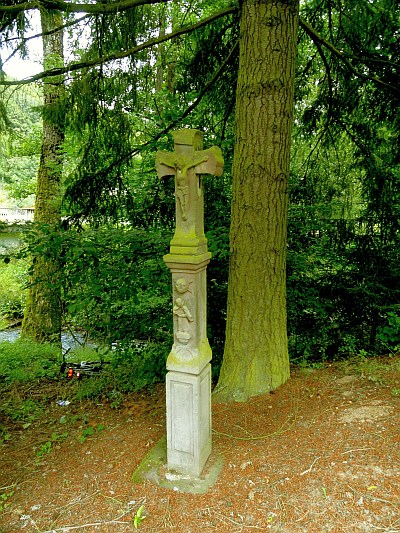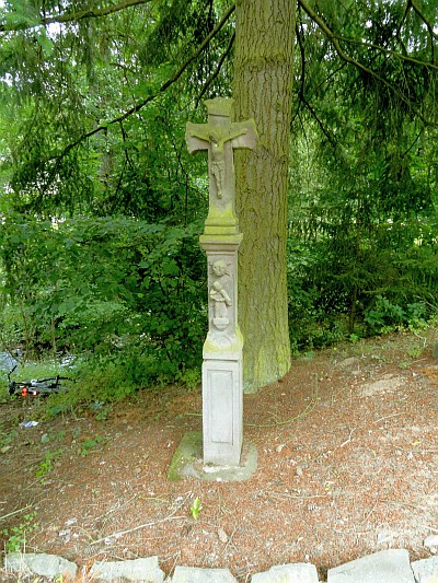 Abschlusskreuz mit doppelt gespaltenen Balkenenden. Die Figur an der Schaftvorderseite mit einem Kind auf dem Arm wohl als heiliger Antonius zu deuten. [1]