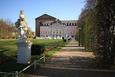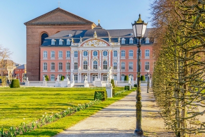 >> Die selbstbewussten Trierer Bischöfe hatten schon um 1200 beschlossen, künftig in der ehemaligen kaiserlichen Palastaula zu residieren. Dieser römische Prachtbau entsprach ganz ihrem Streben nach geistlicher und weltlicher Macht. Erst 1615 begann Kurfürst Lothar von Metternich mit dem Bau eines Renaissanceschlosses. Hierfür musste die Ostwand der ehrwürdigen Palastaula weichen, der Rest wurde zum Bestandteil des neuen Schlosses, das bei den nächsten Kurfürsten anscheinend wenig Anklang fand, denn sie residierten bei Koblenz. Erst Kurfürst Philipp von Walderdorff zog es wieder nach Trier, wo er um 1760 einen rosaroten Rokokobau als Gartenfront des Schlosses neu errichten ließ. Die Zweckentfremdung ließ nicht lange auf sich warten. Von 1803 bis 1930 wurde es abwechselnd von Franzosen und Preußen als Kaserne benutzt.