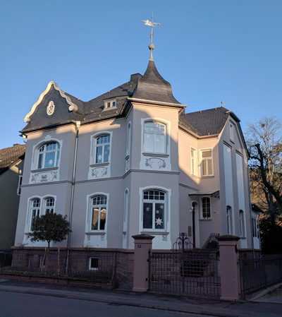 Die um 1910 erbaute vorstädtische Villa zeigt in den korb- und stichbogigen Fenstereinfassungen mit Ohrungen, im verschiefertem Schweifgiebel sowie in den Brüstungsfeldern mit Füllungen in Jugendstilformen die zeittypischen Stilmischungen. Das für die Ausbauphase charakteristische Wohnhaus hat inmitten stärker veränderter Nachbarhäuser die Detailausbildungen und die Ausstattung bewahrt. [1]