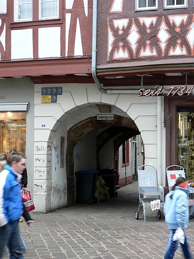 Heute noch durch eine in zwei Häusern eingebaute Pforte am nördlichen Übergang vom Hauptmarkt in die Simeonstraße zu betretende Gasse des spätestens im 11. Jahrhundert bestehenden, erstmals 1235 urkundlich erwähnten Judenviertels (inter Judeos) nordwestlich des Hauptmarkts.