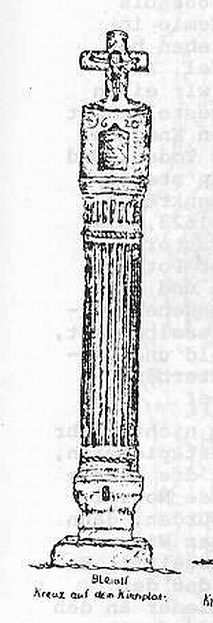 Der am unteren Ende unvollständige Schaft wie beim Kreuz an der Kirchhofsmauer als echte, nur wenig verfremdete toskanische Säule mit Kanneluren ausgebildet. Die Kannelierung des Nischengehäuses davon abweichend ohne Stege und leicht tordiert, die Nische ausnahmsweise segmentbogig geschlossen. Die gleich langen Balken des Abschlusskreuzes flach reliefiert mit verschlungenen Bändern und einer Rosette am Schnittpunkt; auf der glatten Rückseite ein Malteserkreuz und die Jahreszahl. [1]