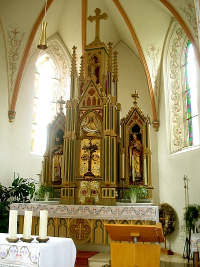 Vor der Südwand der Kirche befindet sich der Grabstein des 1818 verstorbenen Pfarrers Johann Baptist Scheler und ein Schieferkreuz, auf dessen Kreuzstamm sich in flachem Relief die Kennzeichen für ein Priestergrabmal - Kelch und Hostie - befinden.