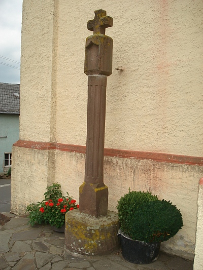 1950 wurde ein hohes, gut er haltenes Nischenkreuz neben dem Kircheneingang aufgestellt dessen urspr. Standort nicht bekannt ist. Das Nischenkreuz gehört dem Typ des Säulenkreuzes an und steckt in einem Fundamentstein von rundem Querschnitt. Die Nische ist flach und kielförmig geschlossen. Am korpuslosen Abschlusskreuz ist noch schwach eine eingeritzte Konturlinie und Kreuz im Kreis zu erkennen. Das Kreuz gilt als südlichster Vertreter einer homogenen Nischenkreuzgruppe, deren Hauptverbreitung im Raum Bleialf liegt. Die größte Übereinstimung besitzt es mit einem auf 1612 datierten Kreuz bei Großlangenfeld.