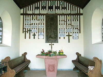 Im Innern ein Holrelief der Schutzmantelmadonna. Geschnitzt von dem Künstler Müller-Roden. Der Entwurf für die beiden bleiverglasten Fenster stammt von dem Trierer Künstler Franzen. [1]