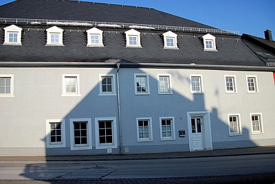 Wohngebäude, ursprünglich Quereinhaus. Durch sein mächtiges, schiefereingedecktes Mansardwalmdach sticht das Gebäude heraus und ist ein Blickpunkt der Durchgangsstraße.
