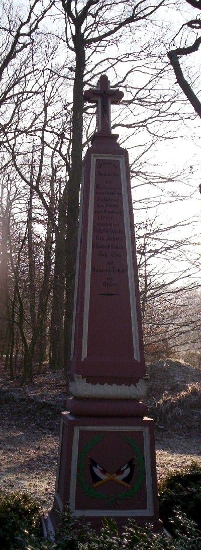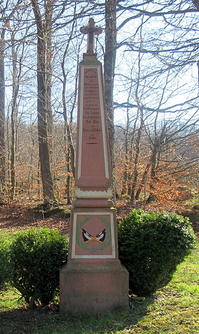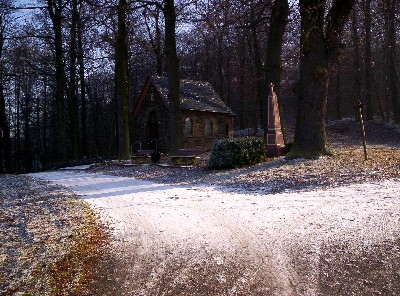 Wie auf dem einen Bild zu sehen, steht, inzwischen etwas schief, neben der Waldkapelle ein kleiner Obelisk mit der Aufschrift: