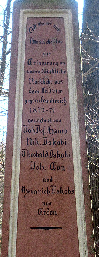 Gott war mit uns. Ihm sei die Ehre. Zur Erinnerung an unsere glückliche Rückkehr aus dem Feldzuge gegen Frankreich 1870-71. Gewidmet von Joh. Jos. Hanß, Nik. Jakobi, Theobald Jakobi, Joh. Con und Heinrich Jakobi aus Erden.