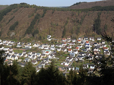 Dem Cordeler Bahnhof gegenüber liegt ein Bergkegel, dessen Spitze mit einem Kreuz geschmückt ist – der Vogelskopf mit dem Vogelskreuz. Die Aussicht von dort oben muß herrlich sein, dachte ich oft, wenn mir auf dem letzten Teil meiner Wanderung der kahle Berggipfel winkte. Ermüdet schob ich stets den Besuch auf ein andermal. Jetzt bin ich oben gewesen und empfand einen Naturgenuß, überraschend großartig, ohne gleichen prächtig, einzig erhaben. Dank der Rührigkeit der Cordeler Eifelvereinsgruppe läßt sich der Gipfel mühelos erreichen. Ein sanft steigender, breiter, sauberer Pfad führt durch schattigen Wald in vielen Serpentinen hinan. Ab und zu bietet sich an den Biegungen des Steiges durch kleine Waldlücke ein beschränkter Blick in die Ferne, der die Erwartung um so mehr steigert, bis endlich der reizende Pavillon an der Bergkante erreicht ist. Wie eine Erlösung wirkt die freie Aussicht ins Kylltal, weit darüber hinweg bis jenseits der Mosel. In geringer Entfernung ist die Bergspitze mit dem Kreuz auf einem Felsenplateau von zirka 20 Quadratmeter. Rundum schweift ungehindert der Blick in die Ferne, ein wahrhaftiges Panorama. Der weite Blick aus der Vogelschau hat eine bestrickende Wirkung. Zu meinen Füßen rauschen die Kronen mächtiger Buchen und Eichen. Unten im Tal liegt friedlich hübsch in üppiges Grün eingebettet Cordel, wie ein Ei im flockigem Nestchen. Hufeisenförmig schmiegt sich das Tal an den Bergfuß; mein Auge folgt ihm weithin nach Norden und Süden bis sich das Tal hinter vorgeschobenen Bergrücken verliert. Im Sonnenglanz windet sich die Kyll schlangengleich durch wallende Felder, in regelrechten Kurven ziehen Bahndamm und Straßen dahin. Im weiten Kreise zähle ich an 30 Bergkuppen, nah und weit; neun Täler und Schluchten münden in der Nähe des Berges. Alles prangt in vielfarbigem Waldesgrün. Vereinzelt erblicke ich auf den Höhen saftige Wiesen und auch die Halden der Steinbrüche. Hie und da streckt trotzig ein verwitterter Felskoloß sein Haupt durch das Waldesdach heraus. Gleich hellen Bändern zeichnen sich die Bergstraßen ab, und wo dichter Wald sie aufnimmt, zeigt ein anders getönter Streifen die Richtung. Nach Süden senkt sich das zerklüftete Gebirge, und den Horizont bilden die in blauen Duft gehüllten Wälder bei Osburg und Thomm. Eine solche Fülle von erhabenen Natureindrücken ward mir noch nie von einer Stelle aus in der ganzen schönen Eifel. Um so mehr verwunderlich erscheint es mir, daß dieser Aussichtspunkt den Trierer Wanderern so wenig bekannt ist, und das ein jeder begreifen, der auf diese Anregung hin die Schönheit und Pracht unserer engsten Heimat vom Vogelskreuz aus geschaut hat. [1]