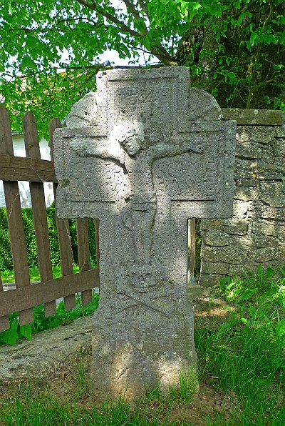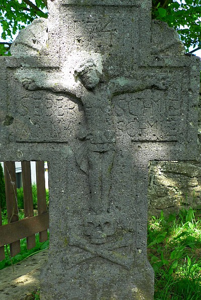 In der Schulchronik konnte ich die Beschreibung eines Kreuzes finden, das ehemals an der alten Schule gestanden hat. Dort schreibt der Dorfschullehrer 1925: Vor der Schule steht jetzt noch ein altes Steinkreuz mit der Christusfigur aus dem Jahre 1741 Es scheint mit dem heutigen Friedhofskreuz identisch zu sein.