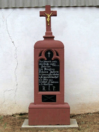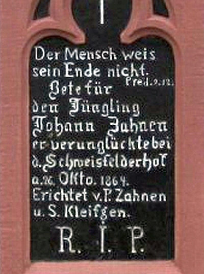 Gedenkkreuz für den 1864 verunglückten JOHANNES ZAHNEN. Eine neugotische Kleeblattbogenblende rahmt die Inschrifttafel. Das Aufsatzkreuz trägt einen gusseisernen Korpus. [1]