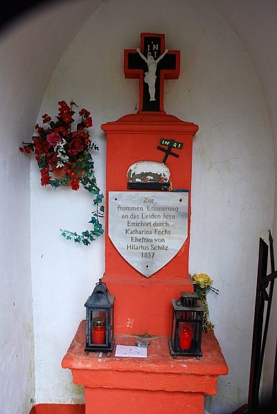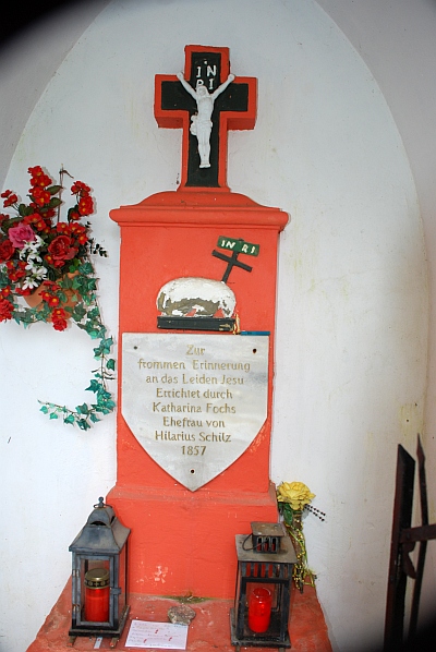 Kleiner, rundbogig geöffneter Putzbau unter Satteldach. Darin auf Steinaltar ein breiter Aufsatz und Abschlußkreuz mit Metallkorpus. Am Aufsatz unter einer Reliefdarstellung des Lamm Gottes eine wappenförmige Inschriftentafel, welche die Stifterin Katharina Fochs und das Errichtungsjahr 1857 nennt. [1]