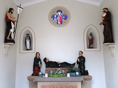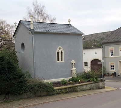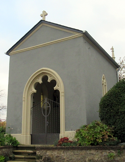 Wegekapelle auf der südlichen Anhöhe am Ortsrand gelegene und damit der Kapelle am Helfanter Berg auf dem gegenüberliegenden Hang antwortende neugotische Privatkapelle von der immerwährenden Hilfe.