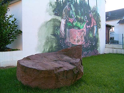 Alfons Stüber aus Heddert dokumentiert mit seinem Wandbild, wie die Steinmetzen im Neunhäuser Wald tonnenschwere Steine an ihren Fundorten zu Reibe- oder Keltersteinen zugehauen und bearbeitet haben.