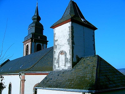 Das Gewölbe der Sakristei mit dem Wappen des Erzbischofs Jakob von Sierck sind wunderschöne aber spärliche romanische Reste einer um 1450 errichteten Kirche, die 1806 durch die Hallenkirche im napoleonischen Stil überbaut worden ist.
