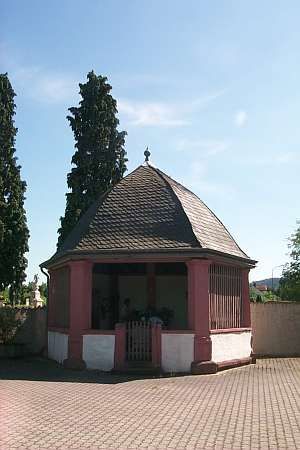 Sechseckige, an drei Seiten offene barocke Wegekapelle, deren geschweiftes Haubendach von den gesockelten Eckpfeilern getragen wird. Bei der Anlage des Friedhofs im frühen 19. Jahrhundert wurde die Kapelle am nordwestlichen Eckpunkt einbezogen und 1980 leicht von der Straße zurückversetzt.