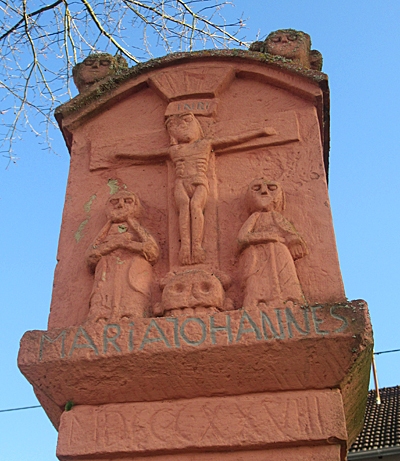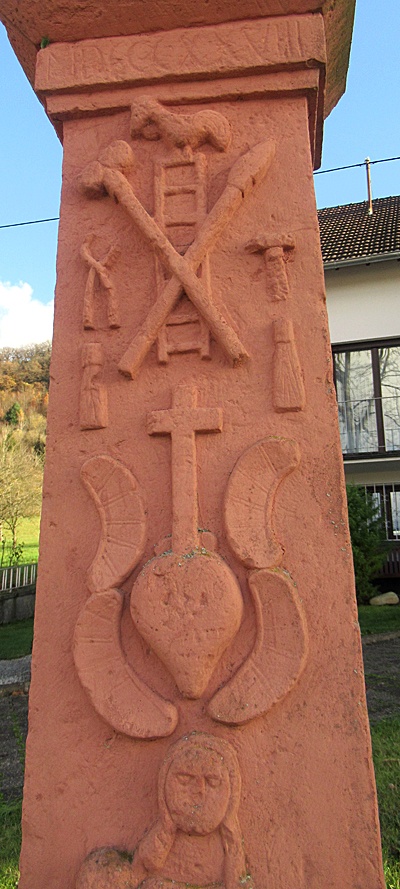 Den Schaft bedecken handwerklich ausgearbeitete Darstellungen der Leidenswerkzeuge und eine Pietà; der Kreuzfuß HEIT DATO DEN 11. JUNI 1828 bezeichnet. Das Kreuzigungsrelief mit den benannten Beifiguren Maria und Johannes und dem gekrönten Christus auf Totenkopf. Als Akroterien der rundbogigen Verdachung Engelsköpfe. [1]