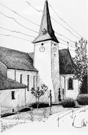 An der Südseite befindet sich zwischen altem Chor und neuem Schiff der im Kern wohl romanische, im frühen 17. Jahrhundert um ein Geschoß erhöhte Turm. An Ausstattung wurde die Kanzel des 18. Jahrhunderts, der bemerkenswerte, neugotische Hochaltar und die Taufe (beide aus Sandstein) in den Erweiterungsbau übernommen.