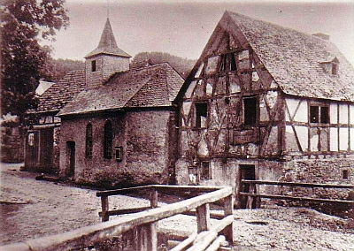 Ein Fotoaus den 1940er Jahren und zeigt ein landwirtschaftliches Gebäude in Fachwerk, die Kapelle und das Schul- und Backhaus und davor die alte Brücke über den Maarbach. Das landwirtschaftliche Gebäude und die Kapelle wurden beim Straßenausbau Anfang der 60er Jahre abgerissen. [2]