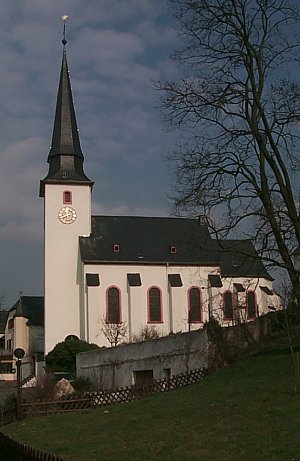 Kirche mit spätgotischem Chor einer alten Kirche, gewölbt, ein Joch und 5/8-Schluß, an der Nordseite eine gewölbte Sakristei; kreuzgewölbtes Langhaus mit Strebepfeilern und schlanker Westturm; Ausstattung meist 18. Jahrhundert Chor gegen 1500; Langhaus und Westturm 1735/36; Stahlenmonstranz und Ziborium von dem Trierer Goldschmied S. Hermann, beide 1773; auf dem Kirchhof seitlich der Apsis eine Kreuzigungsgruppe von 1660.
