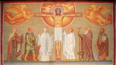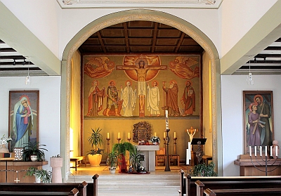 Das Prachtstück der Kirchenausstattung ist das große Wandgemälde von 1953. Es erstreckt sich über die gesamte obere Hälfte der Rückwand des Altarraumes und zeigt in sehr großen Attributen die Darstellung der Kreuzigung Christi mit Maria und Johannes sowie die folgenden Heiligen: Helena, Hubertus, Antonius der Einsiedler und Matthias. In dem Strahlenkranz hinter dem Kreuz befinden sich die Taube des Heiligen Geistes und die Hände Gottvaters, die Krone haltend. Rechts und links hat der Künstler schwebende anbetende Engel angebracht.