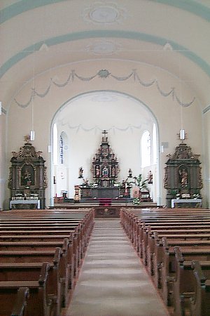 Das Innere bezieht das alte Schiff als ein Joch des korbbogigen tonnengewölbten Raumes mit Gurtbögen über Pilastern ein.