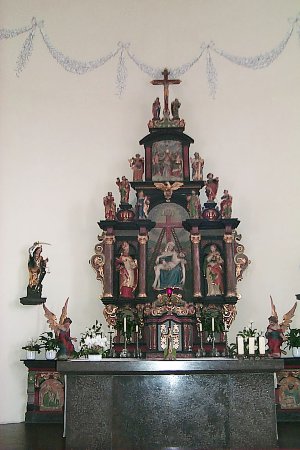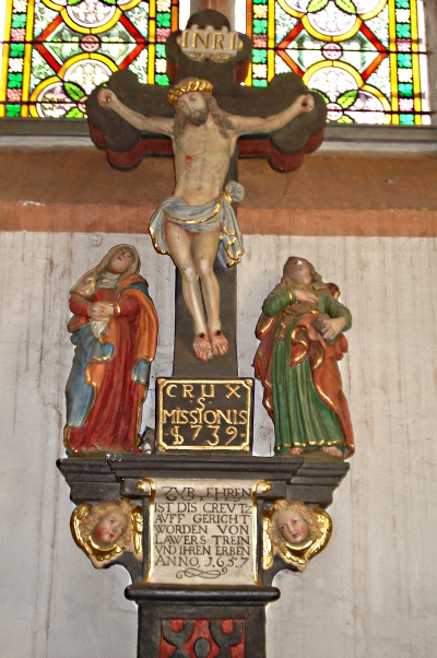 Der alte Chor über Runddiensten rippengewölbt mit runden Schlusssteinen (Lamm Gottes und Engel). Hier Aufgestellt das ehemalige Friedhofskreuz, ein vortrefflicher Kreuzigungs-Bildstock aus verschiedenen Teilen; der Pfeilerschaft mit Beschlagwerg-Dekor wohl um 1600, der Tragbalken mit Stifterinschrift (Lawers Trein und deren Erben, 1657) und der bewegten Figurengruppe darüber. Das Kreuz mit der Umwidmung als Missionskreuz 1739 bezeichnet.