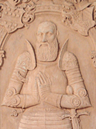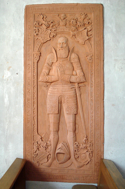 Seitlich Grabstein des dem Chorbau zugeschriebenen, 1558 verstorbenen Richard von Hagen mit vollfigürlicher Darstellung in Rüstung. [1]