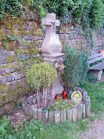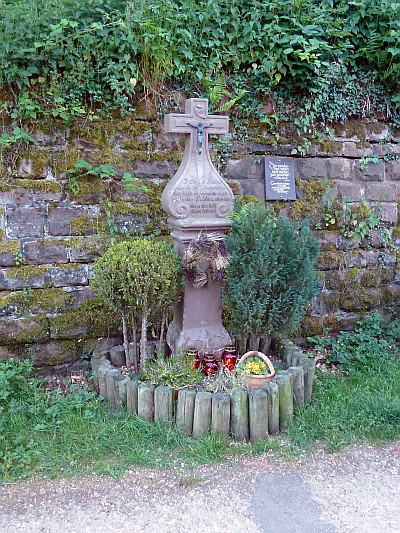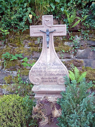 Wegekreuz von 1873 im Ramsteiner Weg nahe den Bahnschranken. Die Initialen der Stifter, J H und J P, stehen wie die Jahreszahl 1873 auf der Rückseite. Der Anlaß zur Kreuzerrichtung ist unbekannt.
