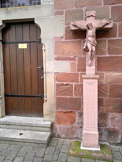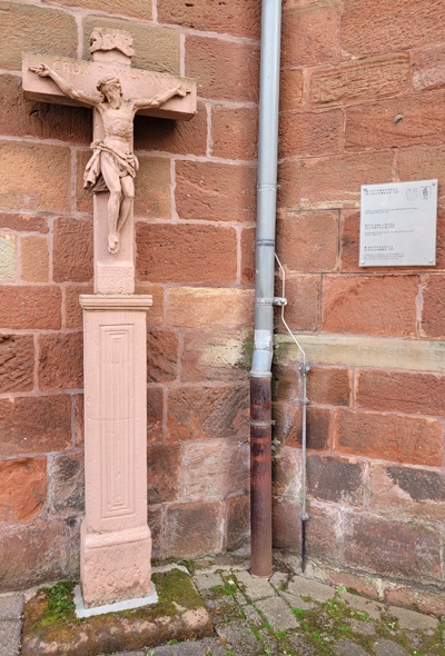 Das Kreuz befindet sich (wieder) am rückwärtigen Teil der Kirche, neben Eingang zur Sakristei, Fröhlicherstraße (August 2020).