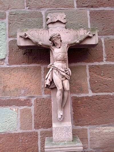 Basis und Schaft eines verlorengegangenen Kreuzes von 1624 sind in glücklicher Weise mit dem Missionskreuz von 1727 zusammengefügt worden und haben im Zentrum des Stadtteils, an der Kirchturmfront zur Oberstraße, den besten Platz gefunden, den man dem schönen Kreuz wünschen kann. Die Voraussetzungen wurden 1959 bei der Renovierung der Kirche geschaffen, als das ehemalige Hauptportal zugemauert wurde. Die kirchliche Weihe erhielt das Kreuz am 3. Juni 1978. Vorher stand es nicht ungefährdet und wenig beachtet am Eingang zur Priestersakristei. [1]