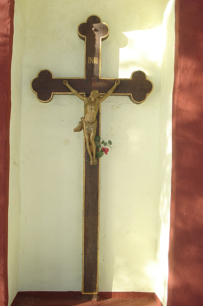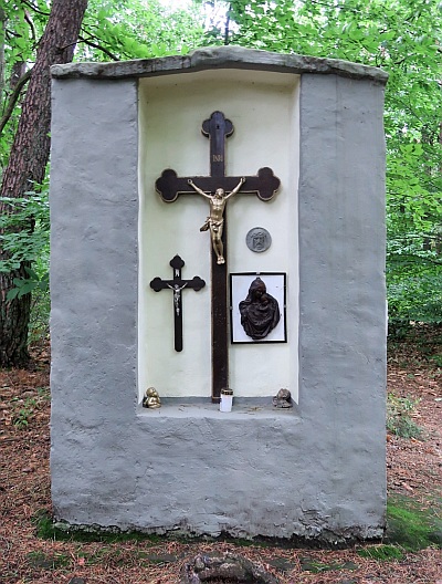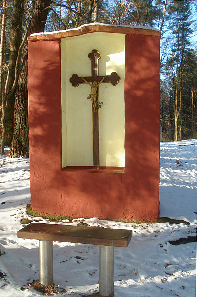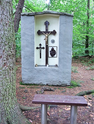 Holzkreuz im Distrikt Großholz auf der Bausch, nahe der [ehemaligen] NATO-Siedlung. Das schlichte Kreuz hat seinen Platz in einer Mauernische, die von Steinplatten überdacht ist. Der Anlaß zur Errichtung ist nicht bekannt, kam jedoch von Pfalzel, und zwar nach dem Jahrhundertbeginn. [1]