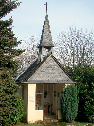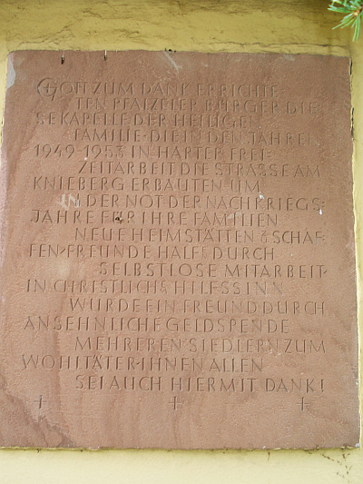 Die Kapelle zur Heiligen Familie am Knieberg ist von den Siedlern der Katholischen Jungen Mannschaft errichtet, die 1949 mit dem Bau ihrer Eigenheime begonnen hatten. Sie sollte nach dem Abschluß des Siedlungswerks ihrem Dank an Gott sichtbaren Ausdruck verleihen. Am 1. August 1951 wurde die Grundsteinlegung der Kapelle begangen, doch begannen die Bauarbeiten erst 1962. An der Planung, Errichtung und Ausstattung beteiligten sich die Anwohner am Knieberg und andere Förderer durch Arbeitsleistungen, Geld- und Materialspenden. Am 29. Mai 1963 nahm Pfarrer Wagner von der Pfarrei Christi Himmelfahrt die Weihe der Kapelle vor. Die Figurengruppe Heilige Familie ist eine Arbeit des am Knieberg mitsiedelnden Bildhauers Paul Siegert.