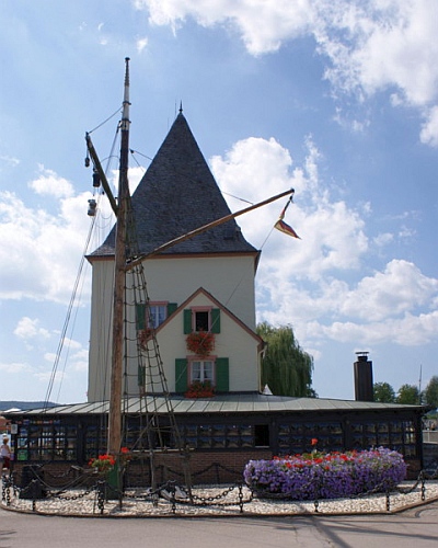 Massiver 3-geschossiger Bruchsteinbau im Grundriss fünfeckig, wovon die Spitze moselaufwärts als Eisbrecher dient. Errichtung Ende des 18. Jahrhundert von Erzbischof und Kurfürst Clemens Wenzelslaus. In Betrieb bis zur Errichtung der Moselbrücke 1906.