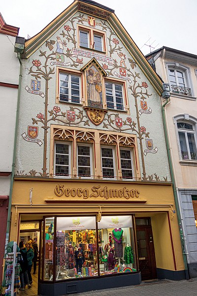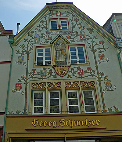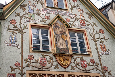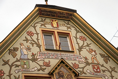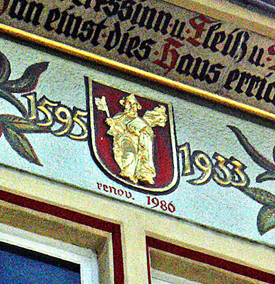 Als Bauzeit des [...] Giebelhauses Nr. 23 ist das Jahr 1595 überliefert. Die kleinere, ebenfalls im Parterre umgebaute Giebelfassade zeigt im ersten Stock spätestgotische Fensterformen: zwei zusammengezogene und zweiteilige Stockfenster, deren Maßwerkdekor den 1596 datierten Gewänden des Hauses Neustraße 42 verwandt ist. Die Anordnung der oberen Fenster - zwei rechteckige, abgefaste Einzelgewände im zweiten Stock und ein kleines Stockfenster im Giebel - geht vermutlich auf eine 1912 erfolgte Fassadenüberformung zurück, die noch heute das Erscheinungsbild prägt. Ihr sind das übergiebelte Bild des heiligen Lukas auf einer Wappenkonsole mit dem heiligen Georg (zwischen den Fenstern des zweiten Stocks) ebenso zuzuschreiben wie die aufgeputzte und farbig gefaßte, jugendstilhafte Rankenzier. Diese weist auf die Handwerksberufe der Hausbewohner in der Art von Zunftzeichen in Wappenform hin: Metzger (vor 1725), Krämer (1725-64), Perückenmacher (1785-93), Schlosser (1793), Uhrmacher (1825-85), Imker (1885-1912) und Maler (nach 1912).