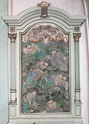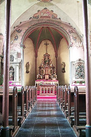 Nach Riss von Seiz, Trier, 1773-74 durch den Maurermeister Michael Steuer, Echternach, erbaut. Turm um 1220. Hochaltar des Malers und Bildhauers Theodor Weinart, Bitburg. Holzrelief der Siebenschläferlegende. [1]