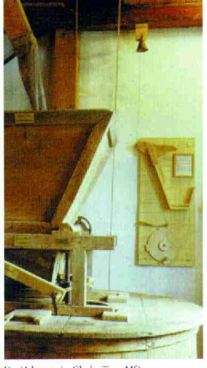 Der Hahn kräht nicht nur auf dem Mist. Er passt auch auf die Mühle auf, wenn der Müller schläft. Der Hahn mit der Glocke, so nannte man die Holzkonstruktion, war unverzichtbar für den reibungslosen Mahlvorgang. Der Hahn ist ein Holzbrettchen, über Schnüre mit einer Glocke verbunden, welches am Trichter und dem Rüttelwerk der Mühle befestigt ist. Durch Trichter und Rüttelwerk muss das Korn auf die Mahlsteine laufen, bei immer weniger Korn läuft das Rüttelwerk immer schneller und der Hahn zieht durch die Bewegung an der Glocke. Der Müller wusste also, ohne ständig aufzupassen, dass nun neues Korn in den Trichter geschüttet werden musste. In der noch voll funktionsfähigen Elektromühle in Monzelfeld können die Besuchenden verfolgen, wie mithilfe scheinbar einfacher Technik aus dem Korn das Mehl gemahlen wird. Das Mahlwerk stammt aus einer aufgegebenen Wassermühle abseits der Siedlung. Erst 1948 wurde es mit einem Elektroantrieb modernisiert und an den Ortsrand platziert. Die Mühlenbücher und Mühlenzettel geben Auskunft über das Mahlrecht der einzelnen Bauern, Der Stolz der Sammlung ist ein Buch von 1829. Als Gemeinschaftsmühle geführt, bekam jeder Bauer einen festen Termin, an dem das Korn zum Mahlen auf die Mühle gebracht wurde.