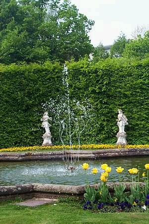 In der Blickachse zwischen Kurfürstlichem Palais und Kaiserthermen liegt ein barockes Kleinod im Kreis halbrunder Buchsbaumhecken und zierlicher Gartenfiguren. Ein fünfdüsiger rotierender Wasserspeier schickt das erfrischende Nass in die Luft, wo es sich wie eine Spirale in sich dreht und in unzähligen feinen Tröpfchen auseinander fällt. Elegant schwingt die Beckenumrandung in großen halbrunden Ausbuchtungen und scheint der Bewegung des Wassers folgen zu wollen.