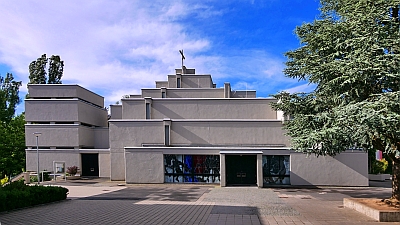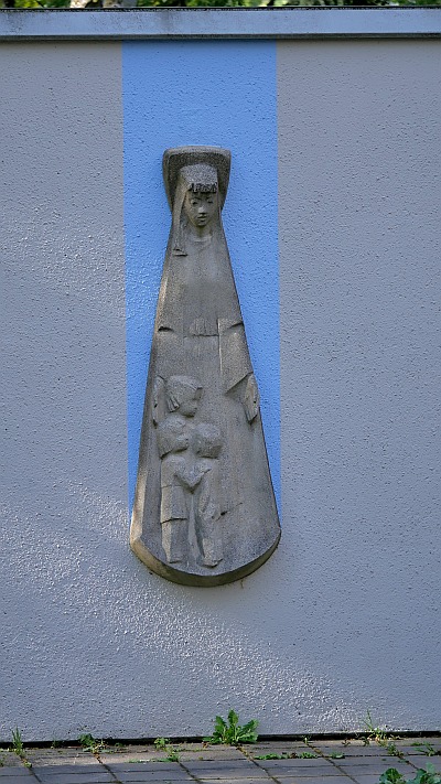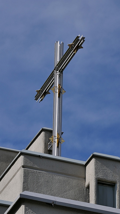 Stufenpyramidenförmige Stahlbetonkonstruktion mit Lichtbändern und –kuppeln, 1968–70, Architekt K. Schmitz, Dillingen, Glasfenster von Jakob Schwarzkopf, Altarinsel 1982 umgestaltet von O. H. Hajek. [1]